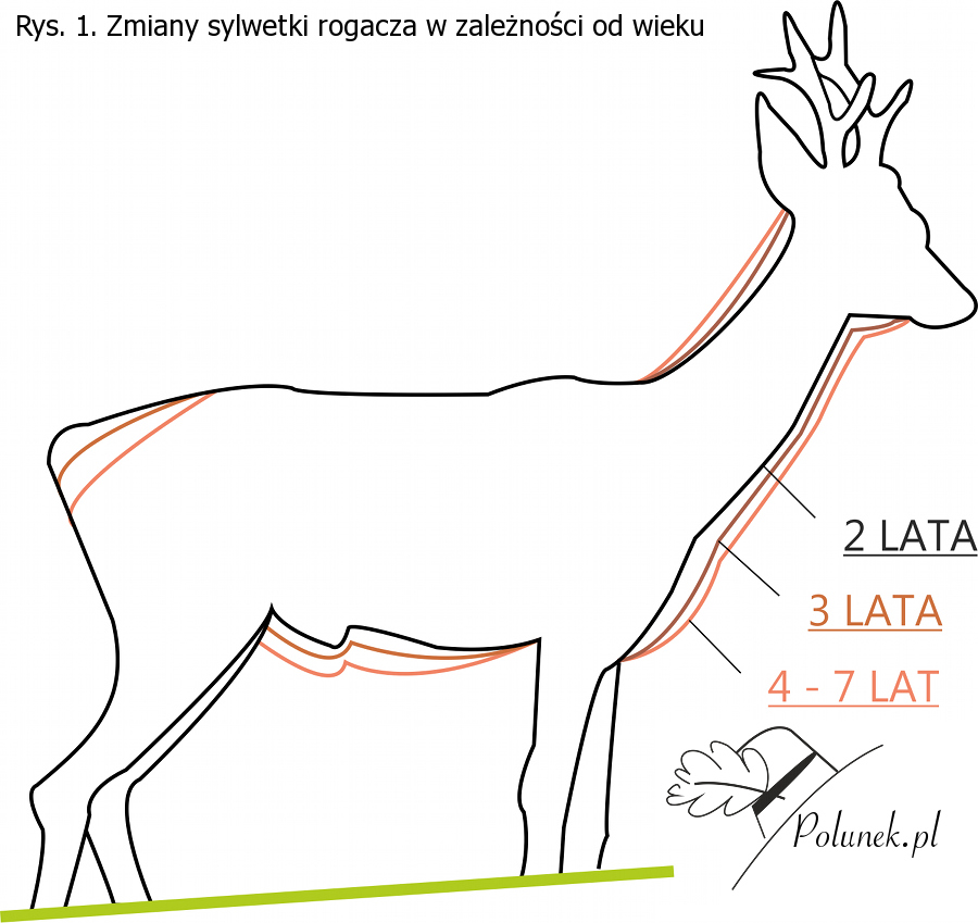 Nie zawsze widzimy całego kozła. Często jest ukryty przykładowo w zbożu. Jednak to właśnie sylwetka mówi nam najwięcej o wieku rogacza. Zależność budowy ciała od wieku ilustruje nam poniższy rysunek.