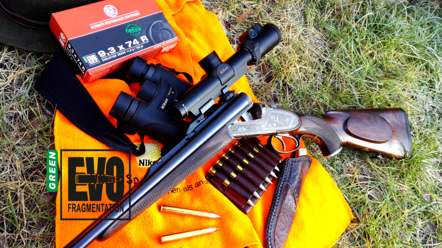 9,3x74R jest kalibrem, który bardziej wybrał mnie a niż ja jego. Poprowadziły do tego różne nie związane ze sobą sytuacje. „Dziewiątkę” używam tak w ekspresie kulowym jak i w kniejówce. Po latach doświadczeń mam do tego kalibru pełne przekonanie. Do tego stopnia że używam go obecnie na każdy rodzaj polowania. Klasyczna amunicja 9,3x74R wyposażona jest w ciężki 18,5 gramowy pocisk półpłaszczowy (286 grain). W ekspresie duże znaczenie ma właściwe wyregulowanie luf, tak aby dwa następujące po sobie strzały z obu luf lokowały przestrzeliny blisko siebie. Lufy justuje się pod konkretną amunicję. W moim przypadku metodą prób i błędów okazało się że amunicja RWS EVO Green na 50 metrów ma wystarczające zgranie przestrzelin. Na przestrzeni lat pozyskałem z tego pocisku ponad 50 sztuk zwierzyny grubej. W mojej ocenie daje to już pewną próbę, na podstawie której mogę wysnuć pewne wnioski. Pocisk jest bezołowiowy, a za tem nietoksyczny. Ma przemyślaną dwuczłonową konstrukcję. Pierwszy człon przy kontakcie z tuszą zachowuje się ekspansywnie fragmentując, jednak głównie w organach wewnętrznych. Efektem jest silny szok uderzeniowy.