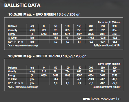 W obcnej chwili RWS oferuje dwa rodzaje amunicji w kalibrze 10,3×68 magnum: